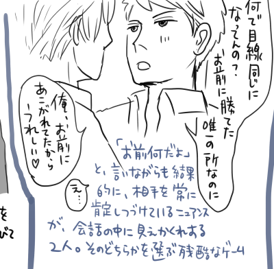 ピュアピュアにまっすぐ顔を近づけて勉強を主人公に教えてる珀くんに、自分も下心がある手前ろこつに注意できない珱介くんは「自分にも教えろ(離れろ)」とぐりぐり攻撃する。
