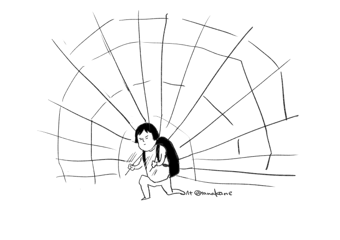 クマ避けリュック ついった絵 2025.08.25 普段はリュックとして使えるんだけど、緊急時ショルダーにある紐をひっぱったら巨大な生物に見える威嚇するやつがバッと出てくる(材質は軽くて丈夫・偉い人と企業努力のたまもの)、クマ避けリュックみたいなのあったらどうかな。