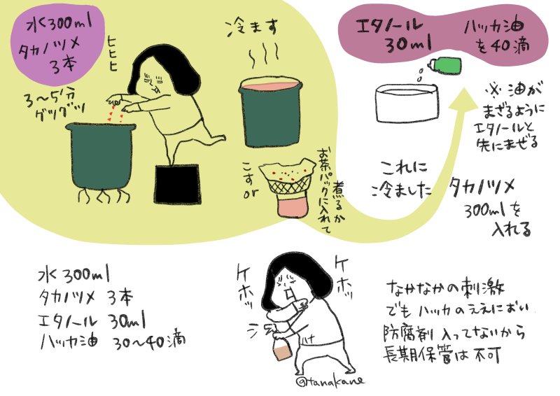 市販の防止スプレーみたいなやつランニングコスト悪いからAIに聞いて作ってみた(効果あるかどうかはまだこれから) まず鷹の爪を煮詰めるというところがニャン主としてはハードル高いのでニャンが別室にいる隙に仕込んだけどそれが難しそうな場合はすり鉢なんかでごりごりした鷹の爪をお茶パックに入れて精製水300mlにつけて1~2日とかでもよいそうな。 でも私は悪い魔女なのでぐつぐつしたった。あとスプレーはポリプロピレン(PP)かポリエチレン(PE)推奨